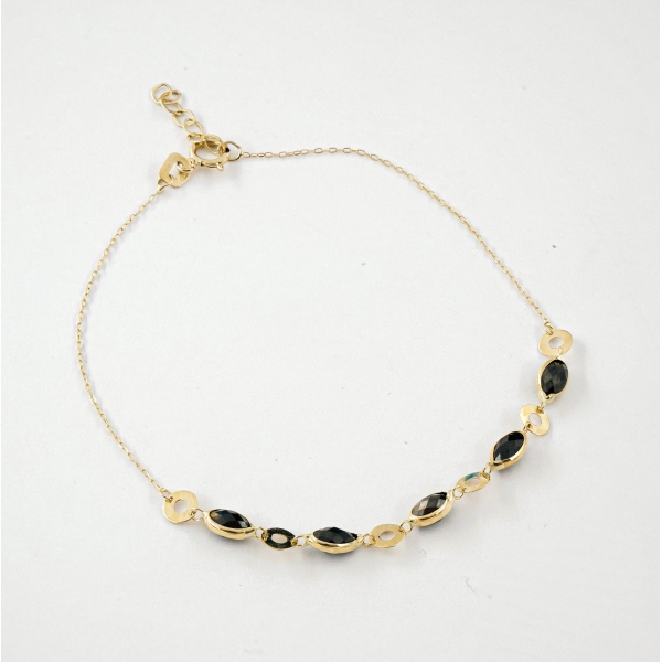 Subtelna celebrytka wykonana z najlepszej jakości żółtego złota próby 585 – 14 karat. Bransoletka została ozdobiona cyrkoniami w kolorze czarnym oraz złotymi okręgami. Idealny prezent dla ukochanej osoby czy też modny dodatek do wyjściowych czy codziennych kreacji, ulubiona biżuteria dla osób, które są zwolennikami minimalizmu lub chcą podkreślić oryginalność stylizacji.