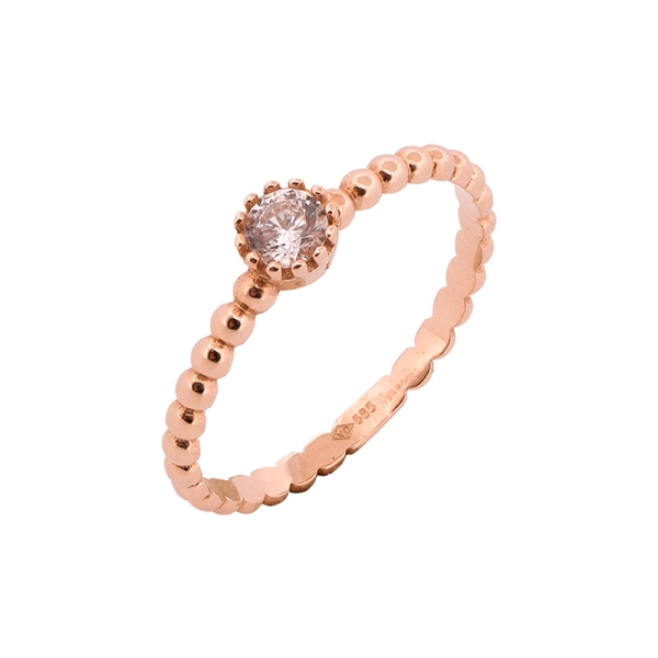 Piękny pierścionek wykonany z najlepszej jakości próby różowego złota 585 – 14 karat. Górka została ozdobiona okrągłą białą cyrkonią osadzoną na łapkach, w oprawie typu chaton, podkreślając urok pierścionka. Szyna wykonana w formie połączonych ze sobą kuleczek. Idealny prezent dla ukochanej osoby bądź uzupełnienie wieczorowej czy codziennej stylizacji.
