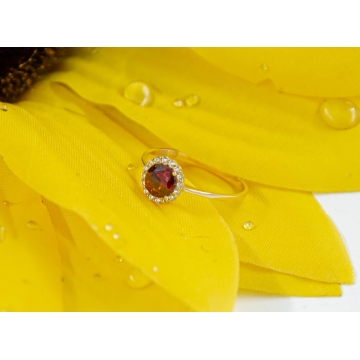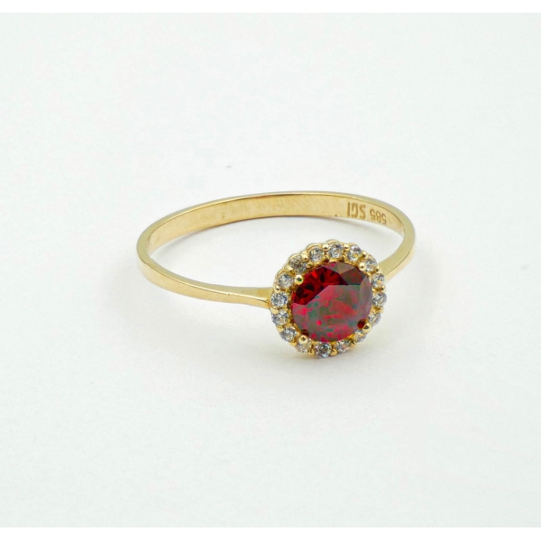 Finezyjny pierścionek wykonany z najlepszej jakości próby żółtego złota 585 – 14 karat. Górka została ozdobiona piękną czerwoną cyrkonią osadzoną na łapkach i w oprawie typu koszyk, wokół której wysadzane są maleńkie białe cyrkonie podkreślające urok pierścionka. Idealny prezent dla ukochanej osoby bądź uzupełnienie wieczorowej czy codziennej stylizacji.