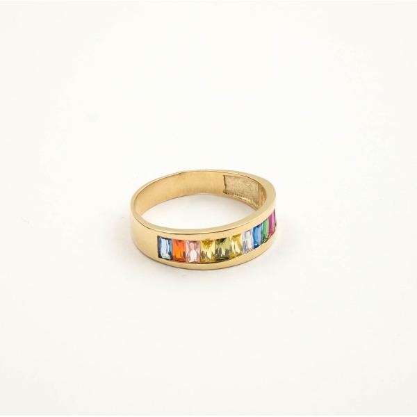 Fantazyjny pierścionek wykonany z najlepszej jakości próby żółtego złota 585 – 14 karat. Forma w kształcie obrączki, zdobiona prostokątnymi cyrkoniami w kolorach tęczy, nadaje całości nadzwyczajnego charakteru. Idealny prezent dla ukochanej osoby bądź uzupełnienie wieczorowej czy codziennej stylizacji.