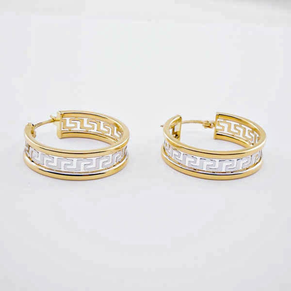 Piękne kolczyki w kształcie koła wykonane z najlepszej jakości żółtego złota próby 585 – 14 karat. Na całej długości zdobione wzorem w stylu greckim, co podkreśla ich nadzwyczajny charakter. Dodatkowo wzór został pokryty diamentowanym białym złotem dodając kolczykom blasku i niesamowitego uroku. Zapięcie w stylu bigiel – zamknięty. Idealny prezent dla ukochanej osoby czy też ozdoba codziennej bądź wieczorowej kreacji.