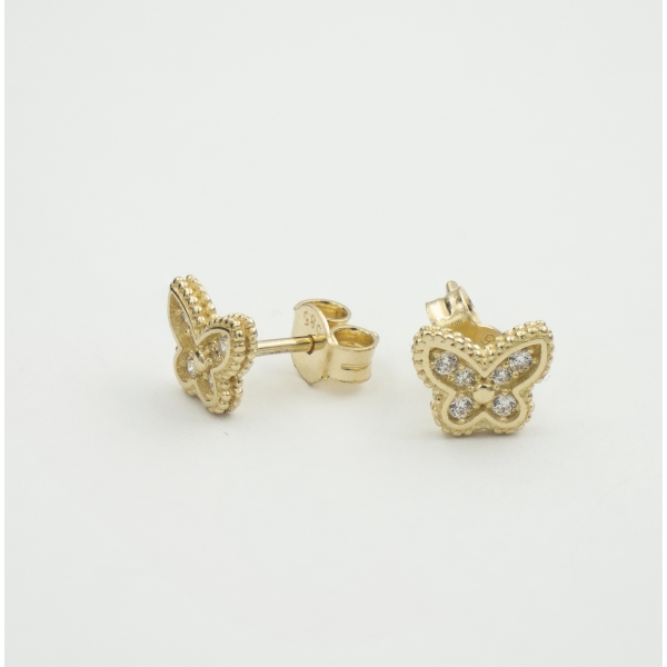 Śliczne kolczyki wykonane z najlepszej jakości próby 585 – 14 karat. Precyzyjnie wykonana forma w kształcie motylka wysadzanego białymi cyrkoniami i ozdobiona na krawędzi ziarnem nadaje im niezwykłego uroku. Zapięcie typu sztyft, potocznie nazywane wkrętkami. Idealny prezent dla dziewczynki z okazji chrztu, I Komunii Św. czy innej specjalnej okazji.