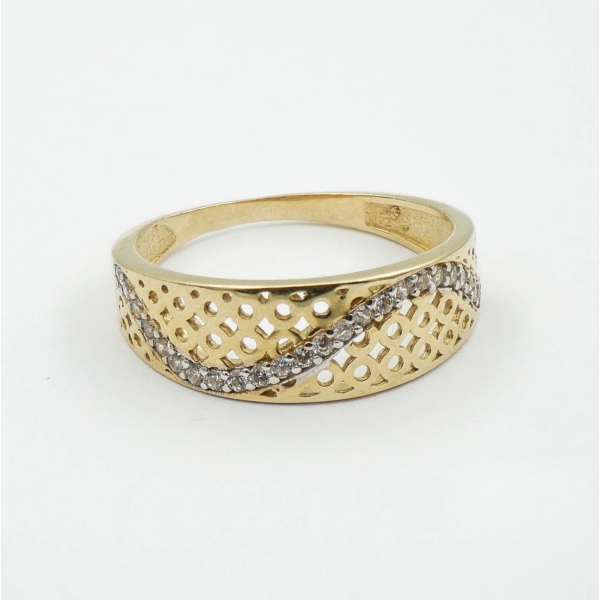 Przepiękny pierścionek wykonany z najlepszej jakości próby żółtego złota 585 – 14 karat. Ażurowe zdobienia oraz maleńkie białe cyrkonie, układające się w falę, nadają całości niepowtarzalnego uroku oraz charakteru. Idealny prezent dla ukochanej osoby bądź uzupełnienie wieczorowej czy codziennej stylizacji.