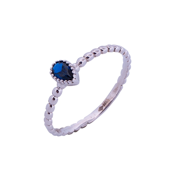 Piękny pierścionek wykonany z najlepszej jakości próby białego złota 585 – 14 karat. Górka w kształcie łezki została ozdobiona granatową cyrkonią osadzoną na łapkach, w oprawie typu chaton, podkreślając urok pierścionka. Szyna wykonana w formie połączonych ze sobą kuleczek. Idealny prezent dla ukochanej osoby bądź uzupełnienie wieczorowej czy codziennej stylizacji.
