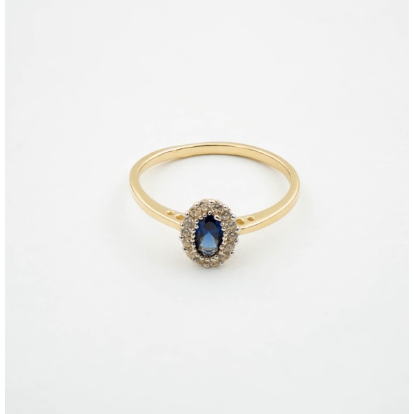 Śliczny pierścionek wykonany z najlepszej jakości próby żółtego złota 585 – 14 karat. Górka została ozdobiona granatową cyrkonią oraz po bokach maleńkimi białymi cyrkoniami. Całość osadzona w oprawie typu koszyk, co nadaje całości nadzwyczajnego uroku. Dodatkowo szyna została ozdobiona okrągłymi wycięciami. Idealny prezent dla ukochanej osoby bądź uzupełnienie wieczorowej czy codziennej stylizacji.