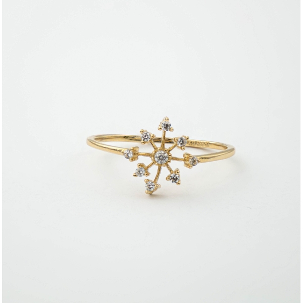 Urzekający pierścionek wykonany z bardzo dobrej jakości próby żółtego złota 585 – 14 karat. Górka w kształcie śnieżynki ozdobiona w punkcie centralnym i na końcach, białymi cyrkoniami, nadaje całości nadzwyczajnego charakteru. Idealny prezent dla ukochanej osoby bądź uzupełnienie wieczorowej czy codziennej stylizacji.