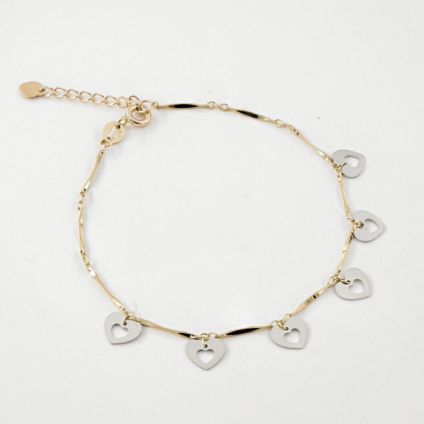 Subtelna celebrytka wykonana z najlepszej jakości żółtego złota próby 585 – 14 karat. Bransoletka została ozdobiona sześcioma zawieszkami w kształcie serca, pokrytych diamentowanym białym złotem. Idealny prezent dla ukochanej osoby czy też modny dodatek do wyjściowych czy codziennych kreacji, ulubiona biżuteria dla osób, które są zwolennikami minimalizmu lub chcą podkreślić oryginalność stylizacji.