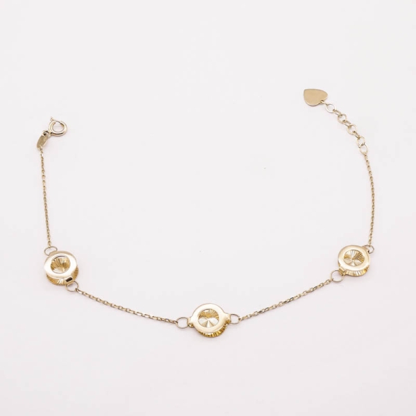 Subtelna celebrytka wykonana z najlepszej jakości żółtego złota próby 585 – 14 karat. Bransoletka została ozdobiona grawerowanymi okręgami, które nadają jej elegancji. Idealny prezent dla ukochanej osoby czy też modny dodatek do wyjściowych czy codziennych kreacji, ulubiona biżuteria dla osób, które są zwolennikami minimalizmu lub chcą podkreślić oryginalność stylizacji.