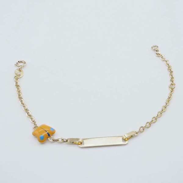 Dziecięca bransoletka wykonana z najlepszej jakości żółtego złota próby 585 – 14 karat. Bransoletka splotu ankier ozdobiona pomarańczowym złotym motylem oraz blaszką idealną pod grawer, na przykład imienia czy ważnej daty w życiu osoby obdarowywanej. Idealny prezent dla ukochanej córki, wnuczki, bratanicy czy siostrzenicy.
