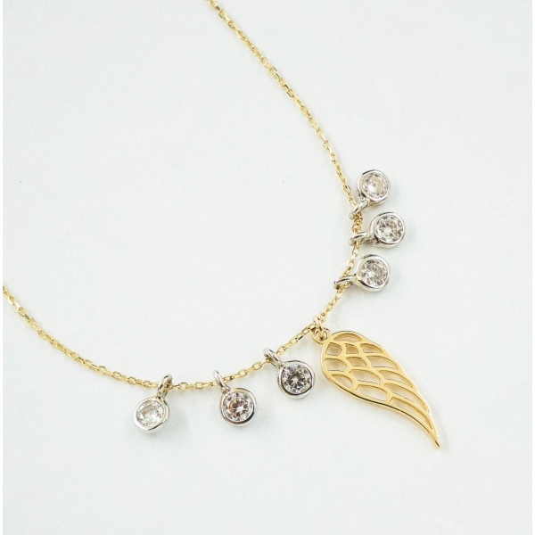 Subtelna celebrytka wykonana z najlepszej jakości żółtego złota próby 585 – 14 karat. Łańcuszek został ozdobiony ażurową przywieszką w kształcie skrzydła oraz białymi okrągłymi cyrkoniami, nadającymi całości niezwykłości i niepowtarzalnego uroku. Idealny prezent dla ukochanej osoby czy też modny dodatek do wyjściowych czy codziennych kreacji, ulubiona biżuteria dla osób, które są zwolennikami minimalizmu lub chcą podkreślić oryginalność stylizacji.