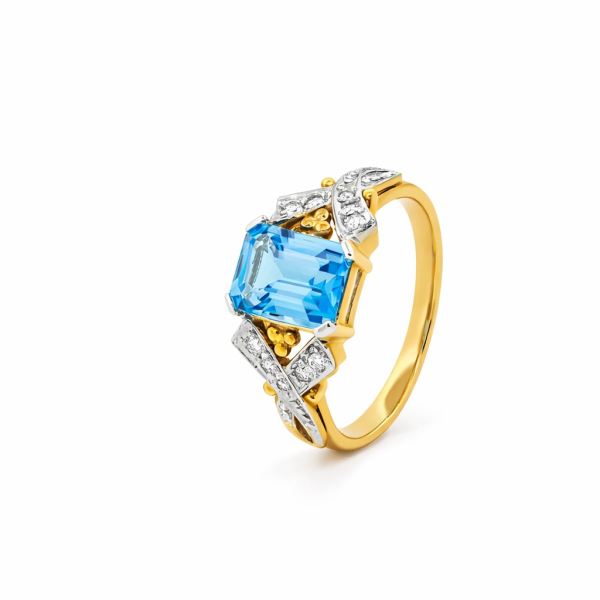 Delikatnie oplatająca kamień oprawa została dodatkowo ozdobiona 10 błyszczącymi diamentami o łącznej masie 0,156 ct, które subtelnie podkreślają blask topazu oraz dodają pierścionkowi wyjątkowej elegancji.