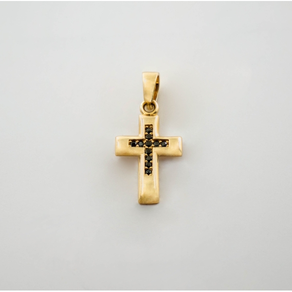 Oryginalny krzyżyk wykonany z najlepszej jakości żółtego złota próby 585 – 14 karat. Wysadzany czarnymi cyrkoniami w oprawie typu kanałowej tzw. channel setting. Całość szlifowana na wysoki połysk. Idealny prezent na Komunię Św. czy Bierzmowanie.