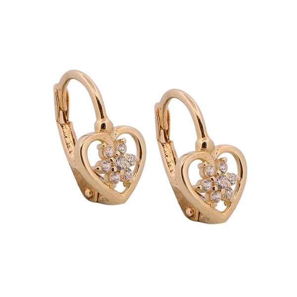 Piękne kolczyki wykonane z najlepszej jakości próby żółtego złota 585 – 14 karat. Forma w kształcie serca szlifowanego na wysoki połysk z wpisaną w środek gwiazdką nadaje całości nadzwyczajnego charakteru. Gwiazdka wysadzana małymi cyrkoniami w kolorze bieli. Zapięcie typu bigiel angielski - klasyczny (automatyczny). Idealny prezent dla dziewczynki z okazji chrztu, komunii, czy też urodzin.