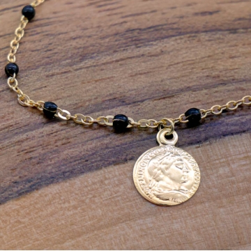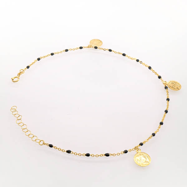 Subtelna bransoletka na nogę wykonana z najlepszej jakości żółtego złota próby 585 – 14 karat. Celebrytka została ozdobiona trzema zawieszkami w kształcie denarów oraz czarnymi koralikami, co nadaje całości niezwykłego uroku. Na denarach została wygrawerowano popiersie Trajana Germańskiego oraz napis: Aw. IMP(eratori) TRAIANO AVG(usto) GER(manico) DAC(ico) P(ontifici) M(aximo) TR(ibunicia) P(otestate) - "Imperatorowi Trajanowi Germańskiemu, Dackiemu, najwyższemu kapłanowi, obdarzonemu władzą trybuńską". Idealny prezent dla ukochanej osoby czy też modny dodatek do wyjściowych czy codziennych kreacji, ulubiona biżuteria dla osób, które są zwolennikami minimalizmu lub chcą podkreślić oryginalność stylizacji.