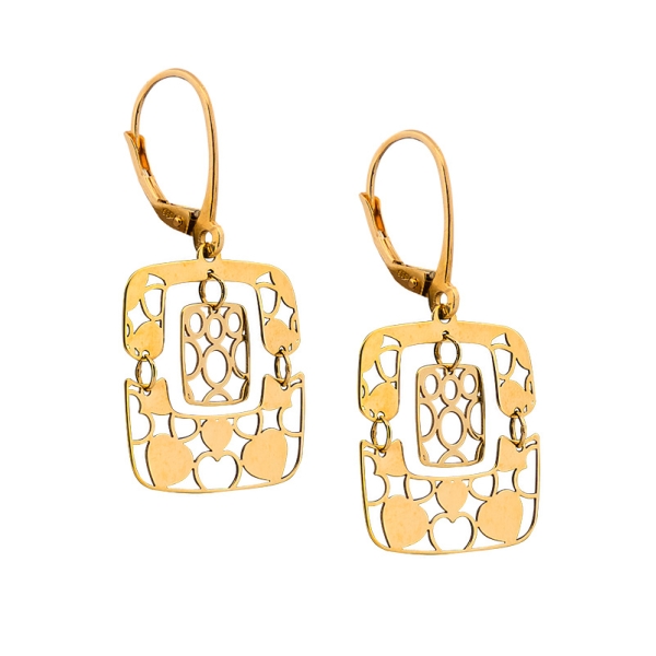 Pomysłowe kolczyki wykonane z najlepszej jakości próby żółtego złota 585 – 14 karat. Precyzyjnie wykonana forma o fantazyjnym kształcie zdobionym precyzyjnie wykonanymi ażurowymi zdobieniami, nadaje im niezwykłego uroku. Zapięcie typu bigiel angielski – klasyczny (automatyczny). Idealny prezent dla ukochanej osoby czy też ozdoba codziennej bądź wieczorowej kreacji.