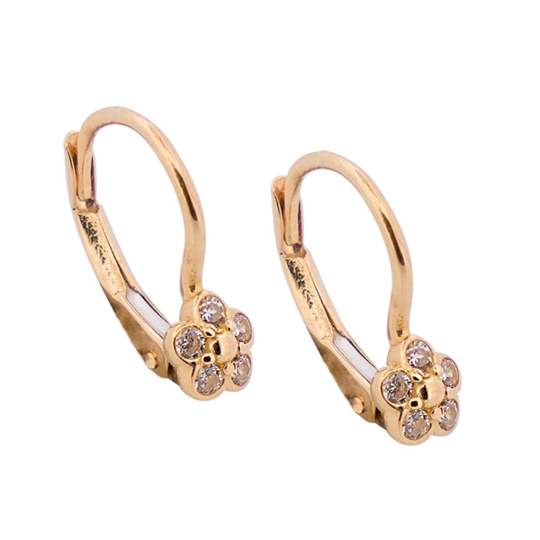 Śliczne kolczyki w kształcie kwiatuszków wykonane z najlepszej jakości próby 585 – 14 karat, zdobione białymi cyrkoniami, co nadaje całości dodatkowego uroku. Zapięcie typu bigiel angielski - klasyczny (automatyczny). Idealny prezent dla dziewczynki z okazji chrztu, I Komunii Św. czy innej specjalnej okazji.