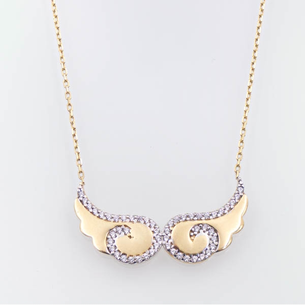 Subtelna celebrytka wykonana z najlepszej jakości żółtego złota próby 585 – 14 karat. Łańcuszek został ozdobiony zjawiskową przywieszką w kształcie skrzydeł wysadzanych białymi cyrkoniami, co nadaje całości niezwykłości i niepowtarzalnego uroku. Idealny prezent dla ukochanej osoby czy też modny dodatek do wyjściowych czy codziennych kreacji, ulubiona biżuteria dla osób, które są zwolennikami minimalizmu lub chcą podkreślić oryginalność stylizacji.