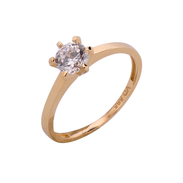 Delikatny pierścionek wykonany z najlepszej jakości próby żółtego złota 585 – 14 karat, szyna zdobiona w punkcie centralnym pojedynczą cyrkonią w kolorze białym osadzoną w oprawie typu chaton. Idealny prezent dla ukochanej osoby bądź uzupełnienie wieczorowej czy codziennej stylizacji, będzie też doskonałym wyborem na zaręczyny.