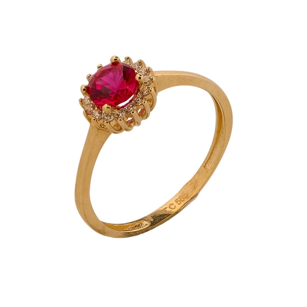 Śliczny pierścionek wykonany z najlepszej jakości próby żółtego złota 585 – 14 karat. Górka została ozdobiona ciemnoróżową cyrkonią oraz po bokach maleńkimi białymi cyrkoniami. Całość osadzona w oprawie typu koszyk, co nadaje całości nadzwyczajnego uroku. Idealny prezent dla ukochanej osoby bądź uzupełnienie wieczorowej czy codziennej stylizacji.