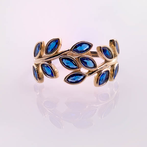 Olśniewający pierścionek wykonany z najlepszej jakości próby żółtego złota 585 – 14 karat. Szyna zdobiona motywem liści wysadzanych cyrkoniami w kolorze granatowym, co nadaje całości dodatkowego uroku i nadzwyczajnego charakteru. Idealny prezent dla ukochanej osoby bądź uzupełnienie wieczorowej czy codziennej stylizacji.