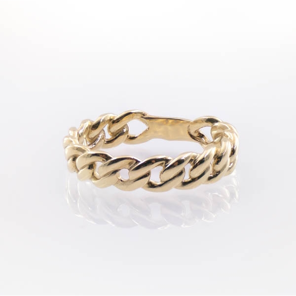 Oryginalny pierścionek wykonany z najlepszej jakości próby żółtego złota 585 – 14 karat. Szyna zdobiona motywem łańcuszka o splocie typu Ankier, co nadaje całości dodatkowego uroku. Idealny prezent dla ukochanej osoby bądź uzupełnienie wieczorowej czy codziennej stylizacji.