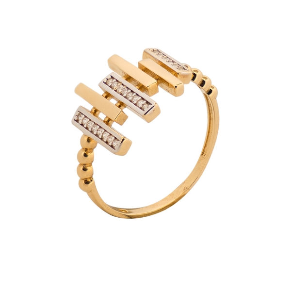 Fantazyjny pierścionek wykonany z najlepszej jakości próby żółtego złota 585 – 14 karat. Szyna zdobiona kilkoma prostokątami o różnej długości tworzących oryginalny wzór. Część prostokątów wysadzana maleńkimi białymi cyrkoniami oraz pokryta na krawędzi diamentowanym białym złotem, część szlifowana na wysoki połysk, co podkreśla wysublimowany charakter formy. Dodatkowo szyna zdobiona złotymi kuleczkami. Idealny prezent dla ukochanej osoby bądź uzupełnienie wieczorowej czy codziennej stylizacji.