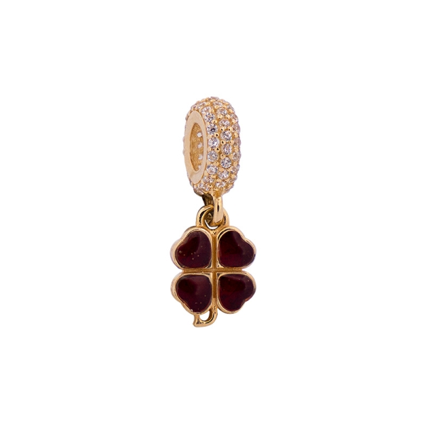 Śliczna przywieszka do bransoletki modułowej wykonana z najlepszej jakości próby 585 – 14 karat. Forma składa się z dwóch części: pierścienia oraz elementu wiszącego w formie koniczynki, co nadaje całości niepowtarzalnego uroku. Koniczyna inkrustowana cyrkoniami w kolorze bordowym, natomiast pierścień wysadzany białymi cyrkoniami. Idealny prezent dla ukochanej osoby czy też ozdoba codziennej bądź wieczorowej kreacji.
